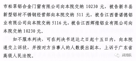 不久前,关于广东凤铝铝业有限公司与惠州市松翠铝合金门窗有限公司、新丰县新型铝材不锈钢经营部、江西普诺德铝业有限公司、江西辉煌铝业有限公司侵害商标权及不正当竞争纠纷一案,一审划上圆满句号。辉知队对侵权行为零容忍,代理原告严格追究侵权者责任,以法释法,以法普法,获法院支持,最终法院判决四被告停止侵权并赔偿损失共计250余万,判决结果如下: